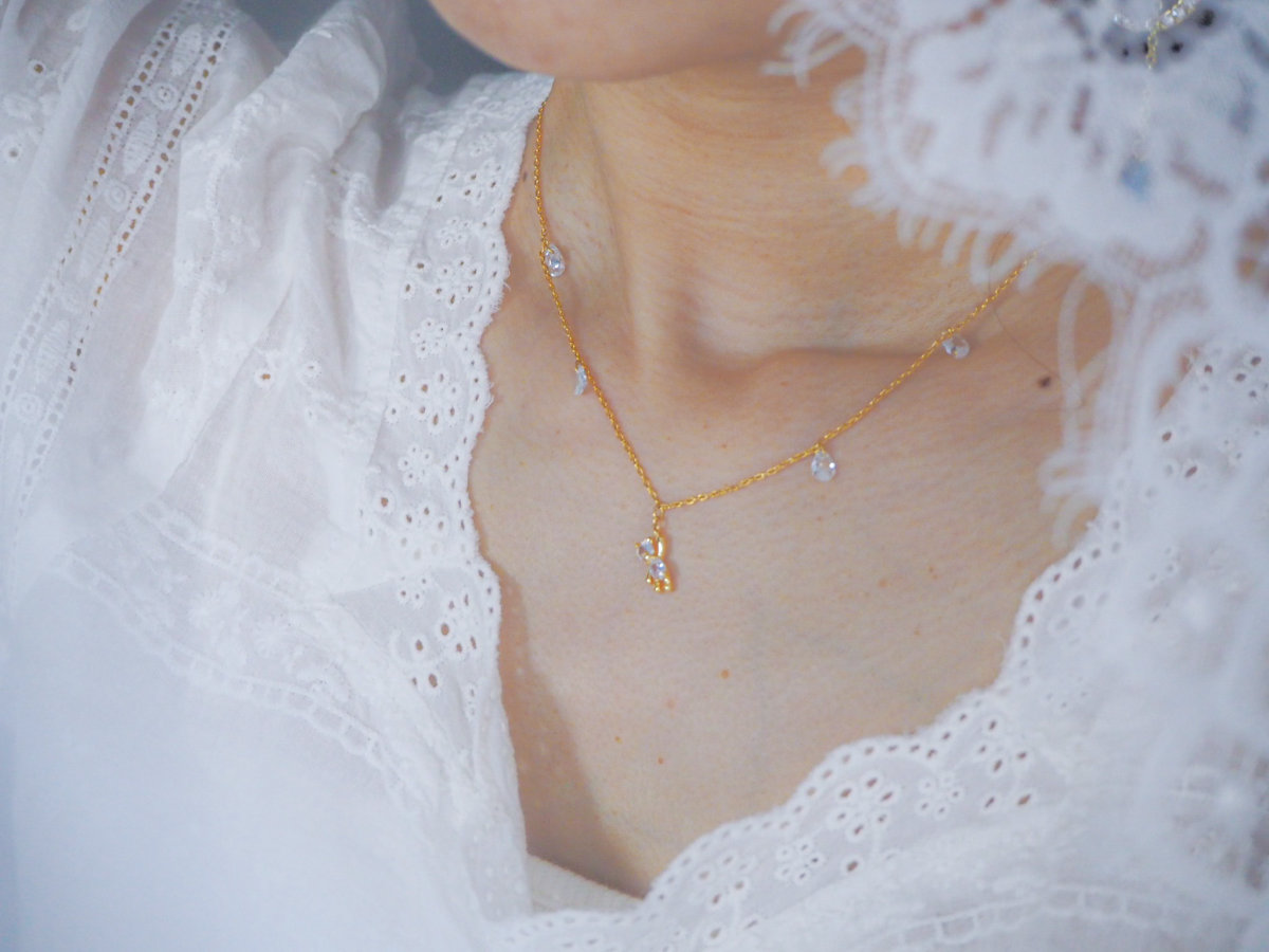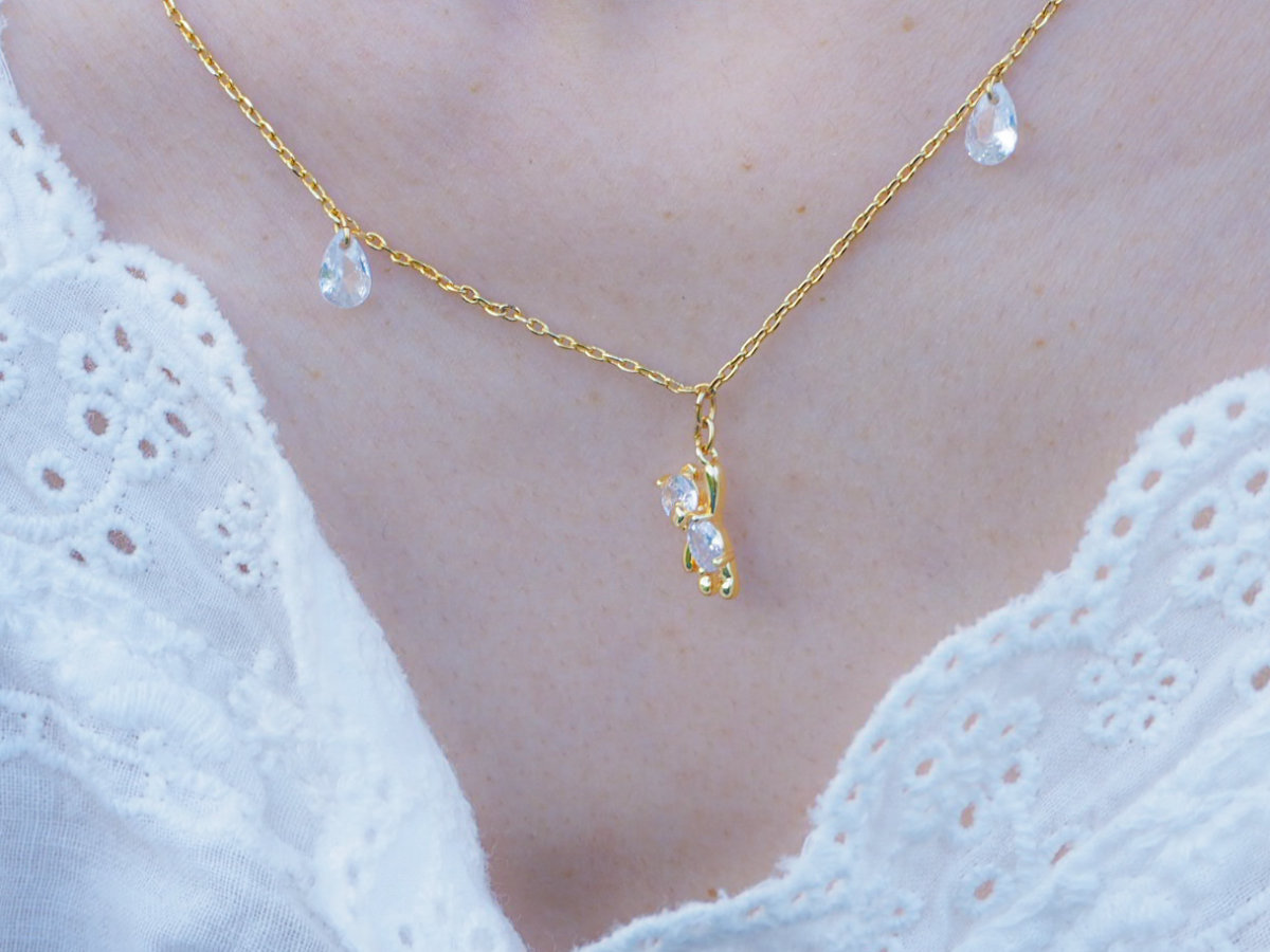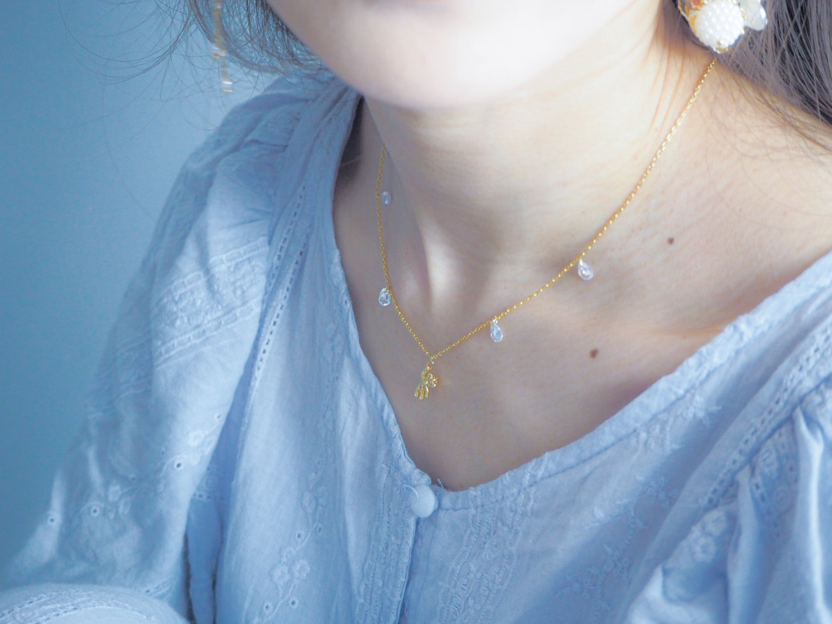 ドロップ型のキュービックジルコニアが左右に揺れるデザインのネックレスです。