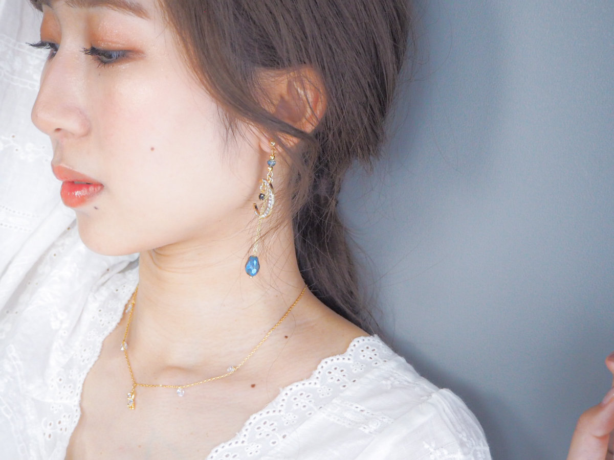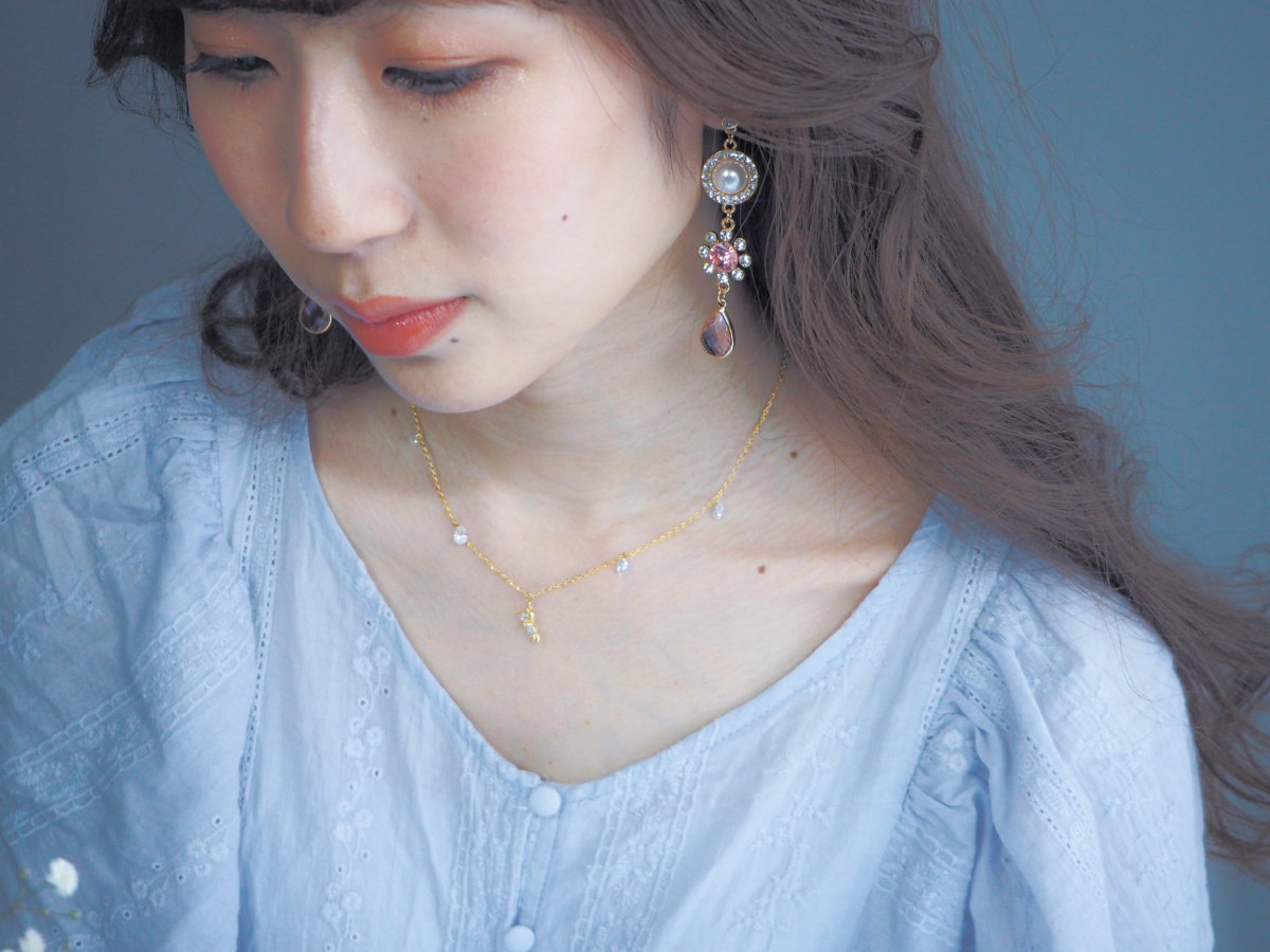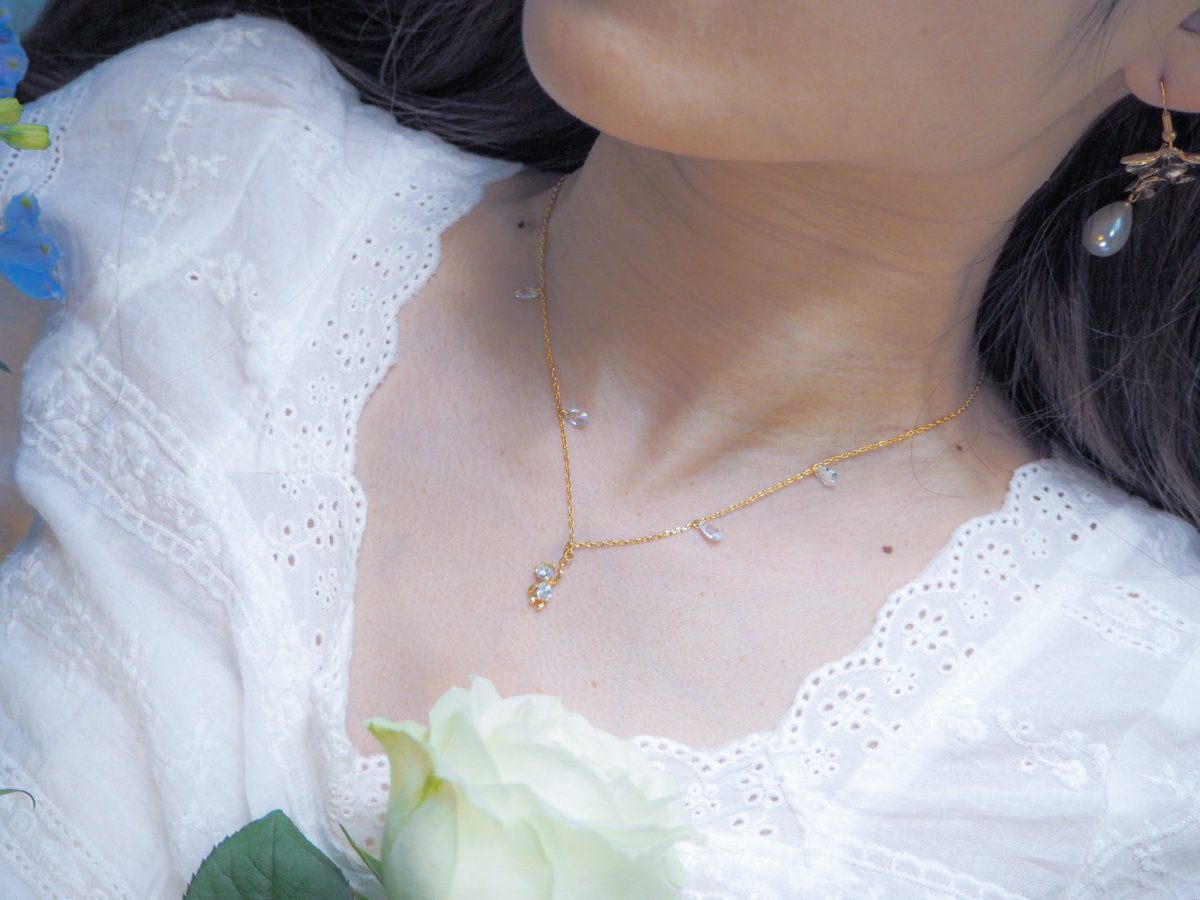 ドロップ型のキュービックジルコニアが左右に揺れるデザインのネックレスです。