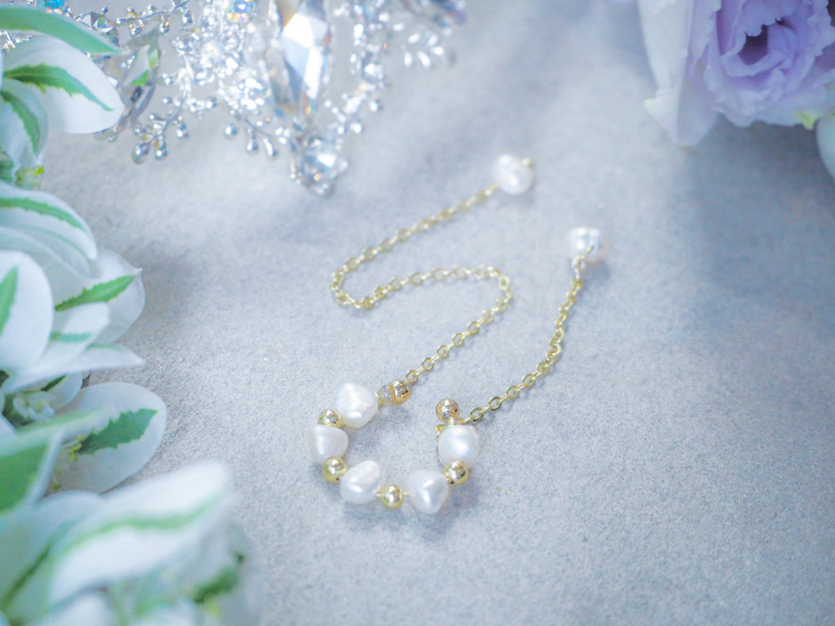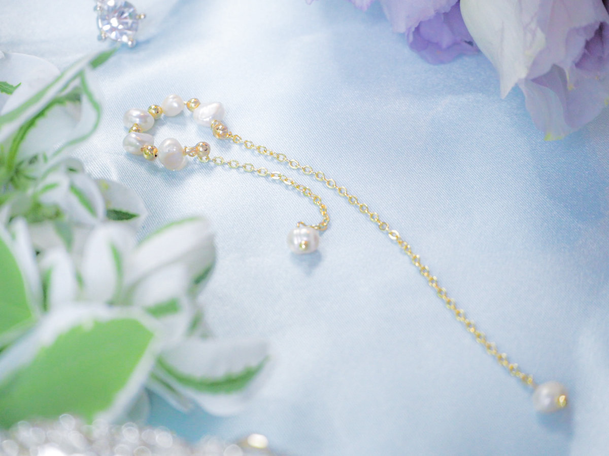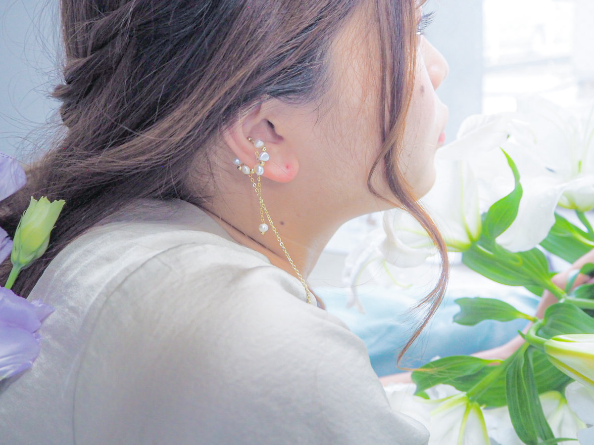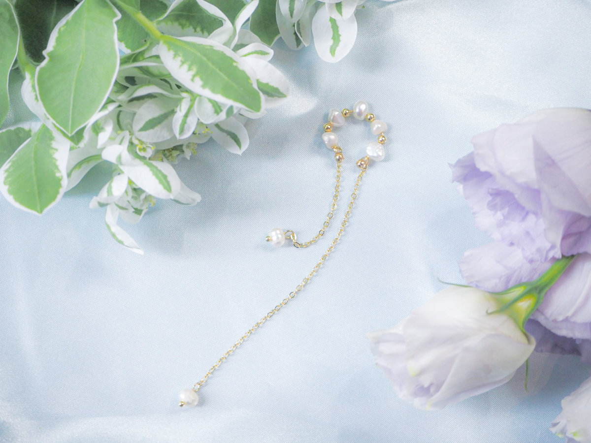淡水パールが連なったイヤーカフ。 長さが違う2本のチェーンが耳元を彩ります。 チェーンが揺れて儚げでニュアンス感をだせるアクセサリーです。 イヤリングやピアスとの重ね付けもおすすめです。