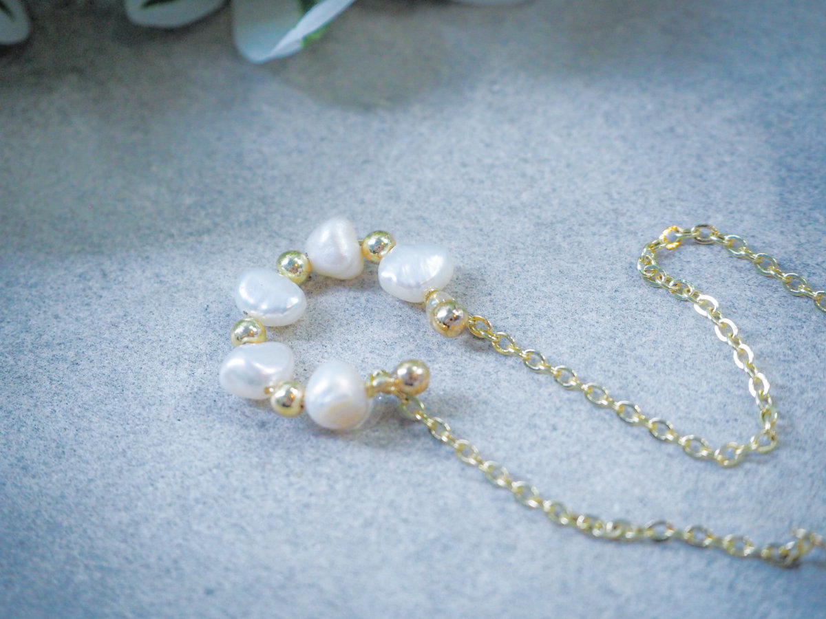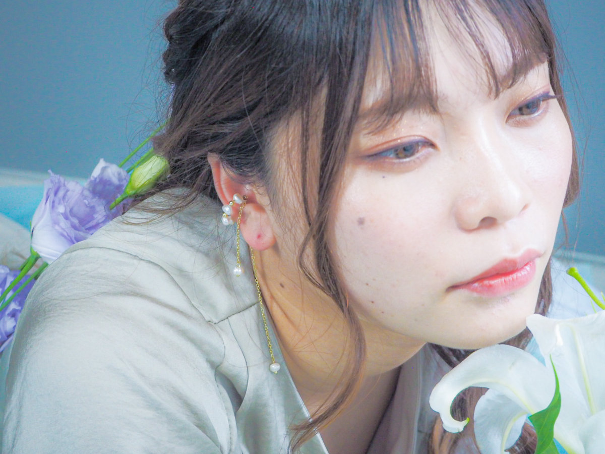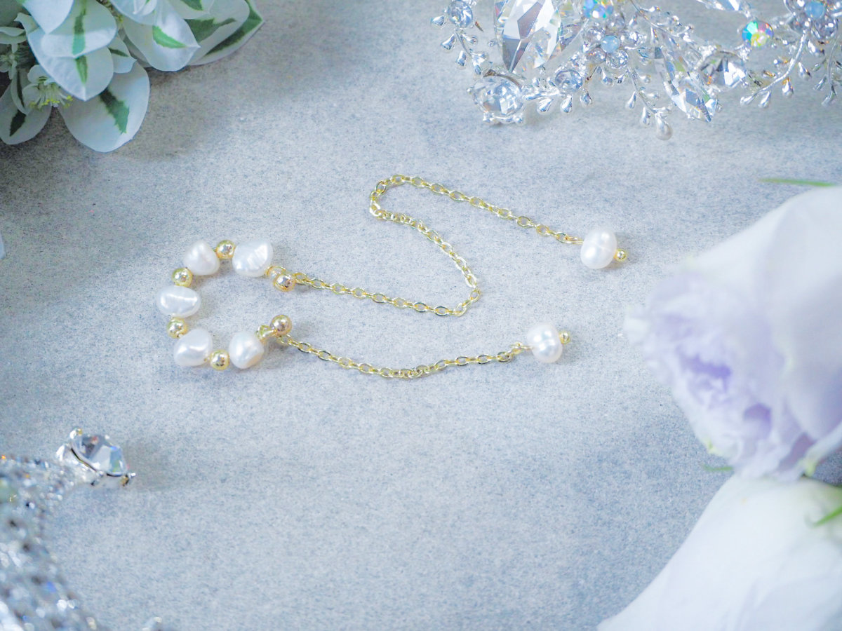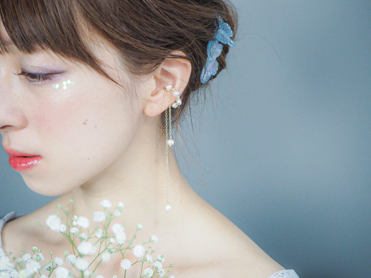 淡水パールが連なったイヤーカフ。 長さが違う2本のチェーンが耳元を彩ります。 チェーンが揺れて儚げでニュアンス感をだせるアクセサリーです。 イヤリングやピアスとの重ね付けもおすすめです。