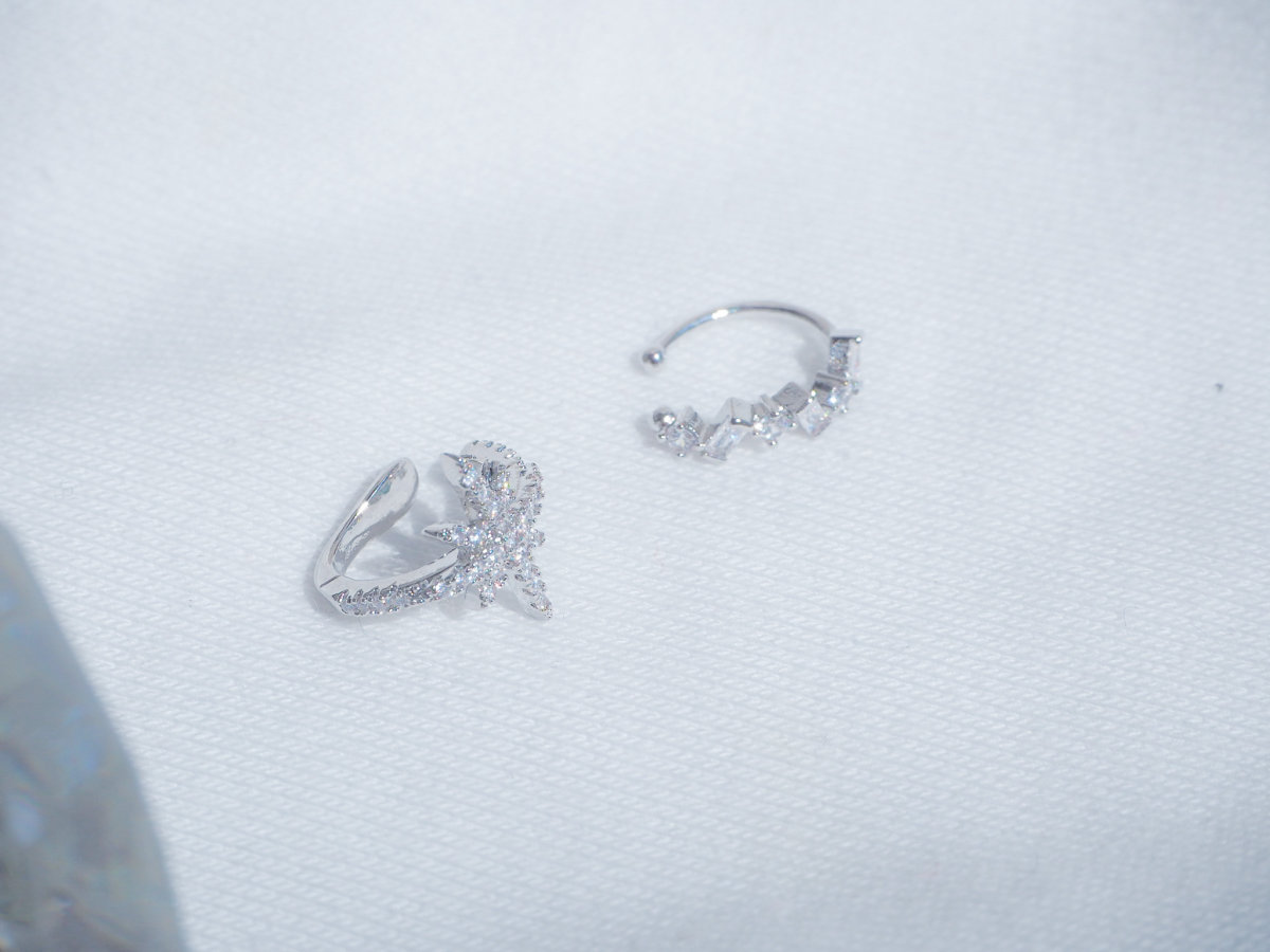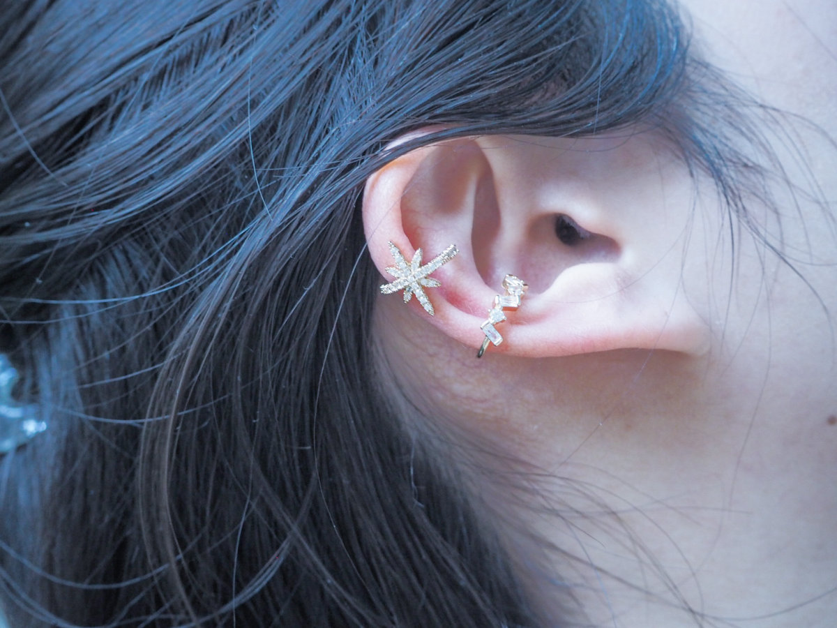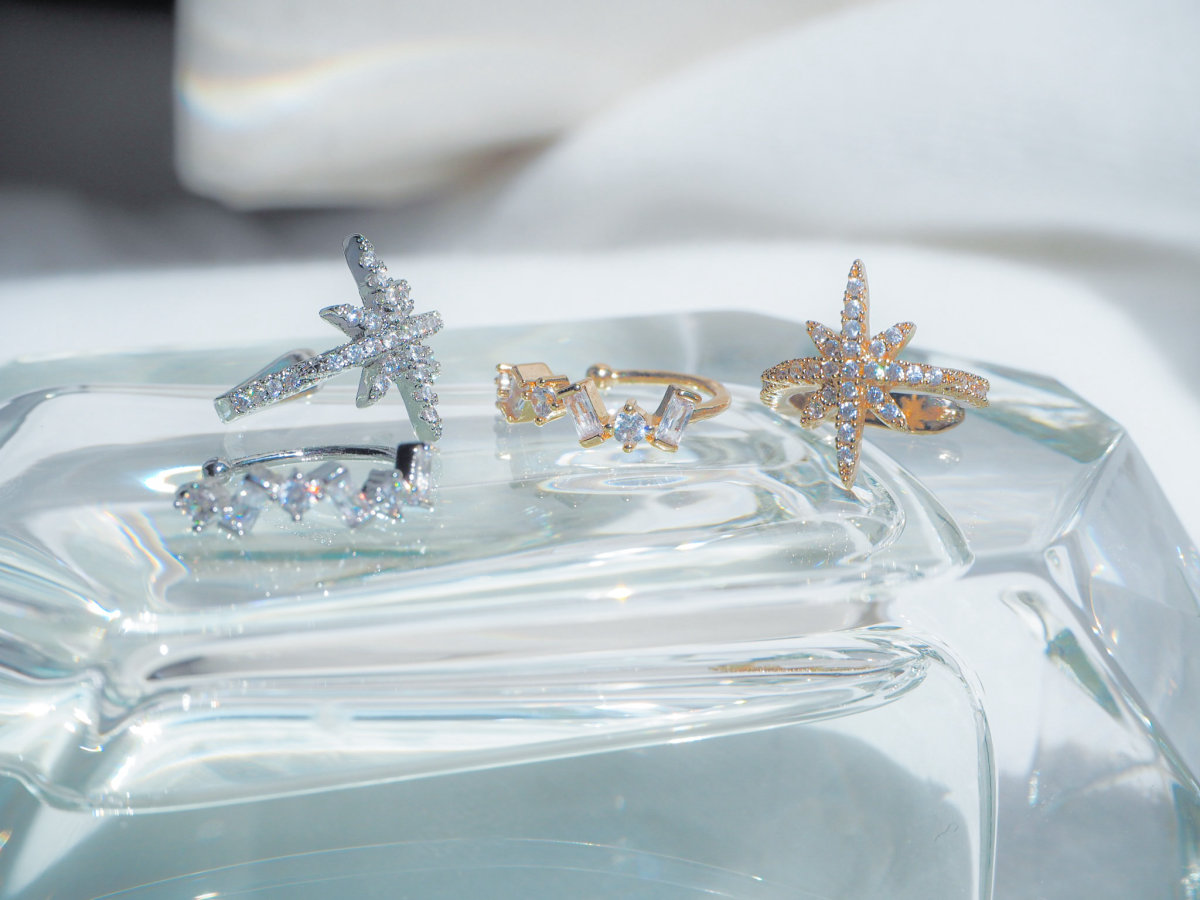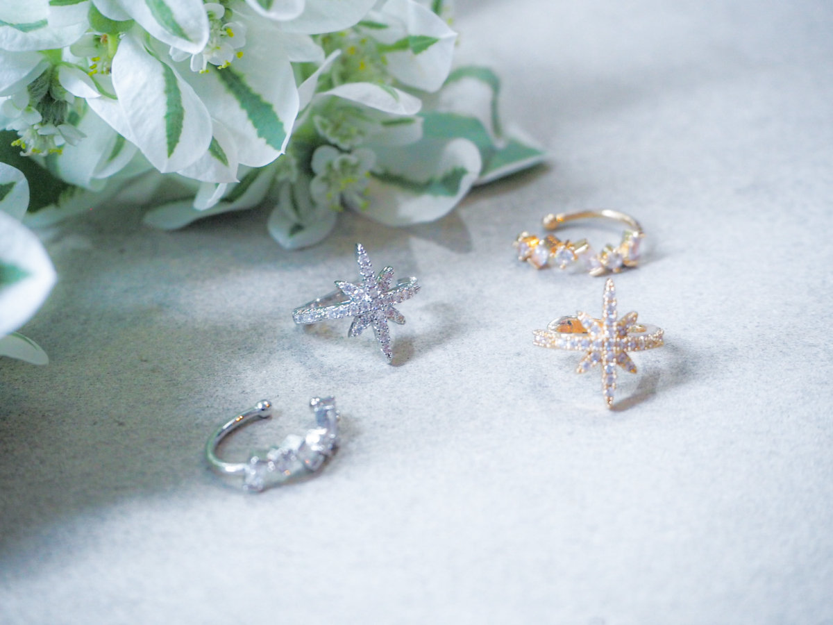星デザインのイヤーカフは、耳にかける部分までビジューで飾られておりどこから見てもキラキラに輝いています。クリスタルのイヤーカフは小さいながら様々な形が並ぶ様が上品な仕上がりとなっています。