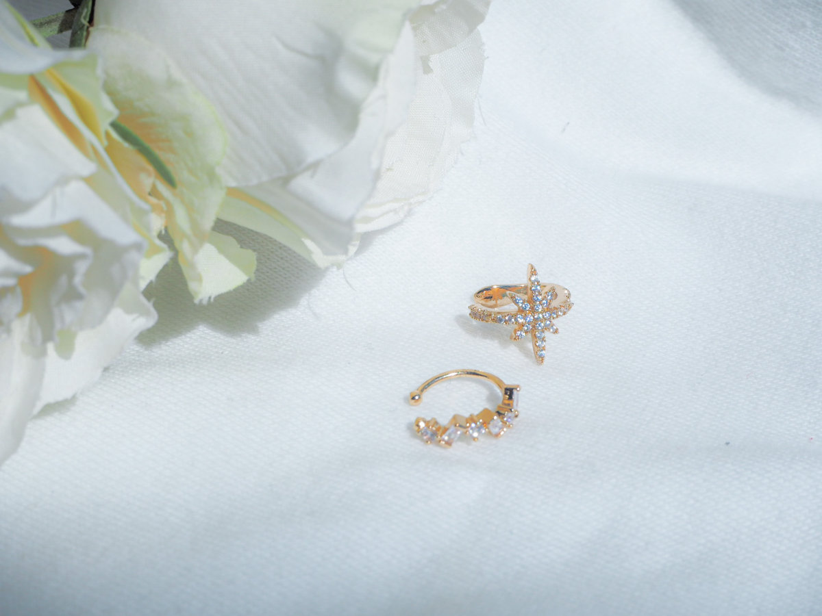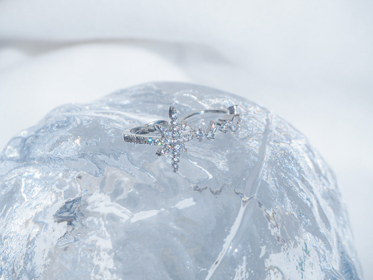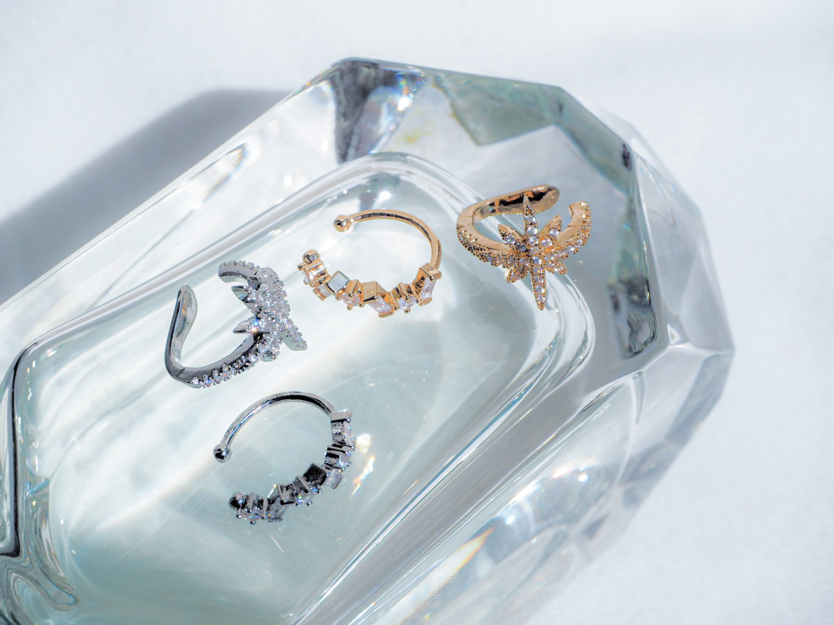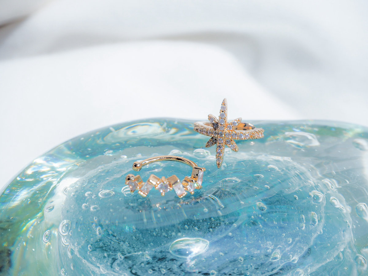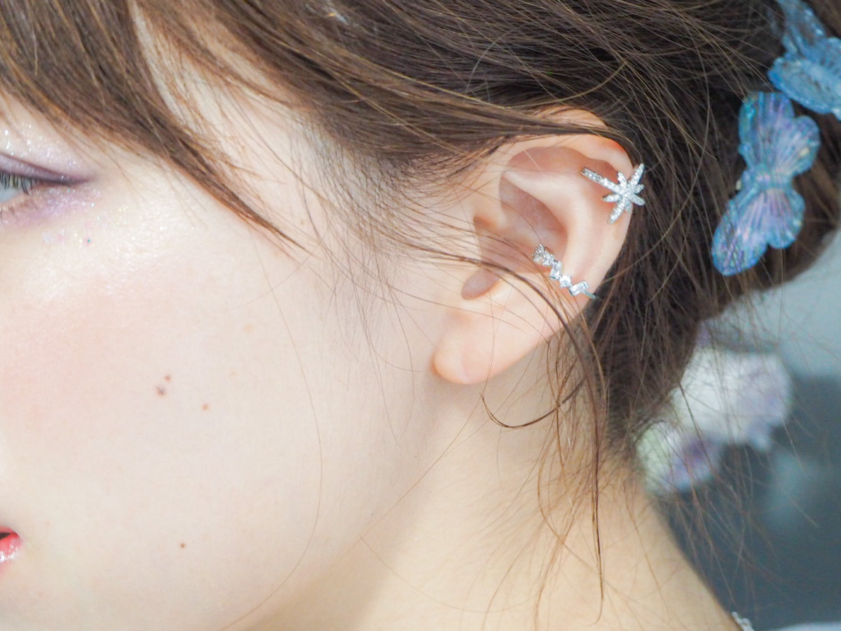 星デザインのイヤーカフは、耳にかける部分までビジューで飾られておりどこから見てもキラキラに輝いています。クリスタルのイヤーカフは小さいながら様々な形が並ぶ様が上品な仕上がりとなっています。