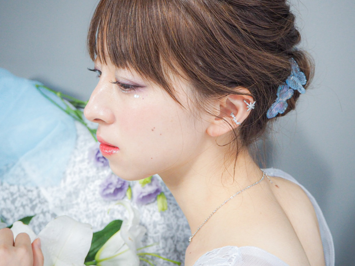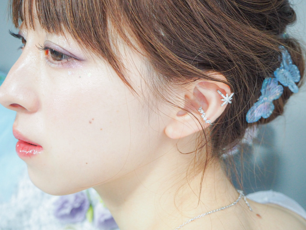 おうし座のプレアデス星団である六連星(むつらぼし)のように小粒ビジューが6粒散りばめられた輝く星と、アルデバランのようにクリスタルがランダムに連なる2つがセットのイヤーカフです。