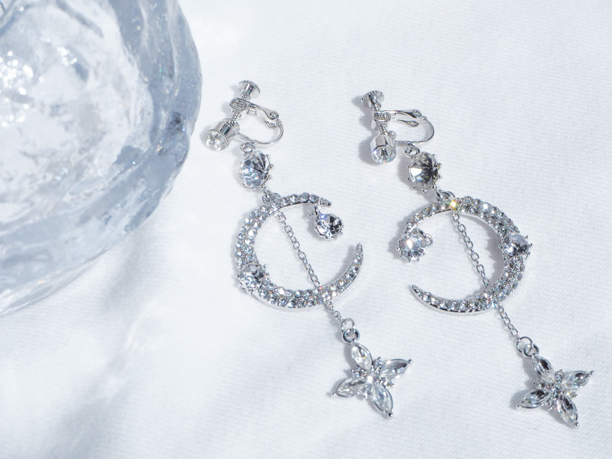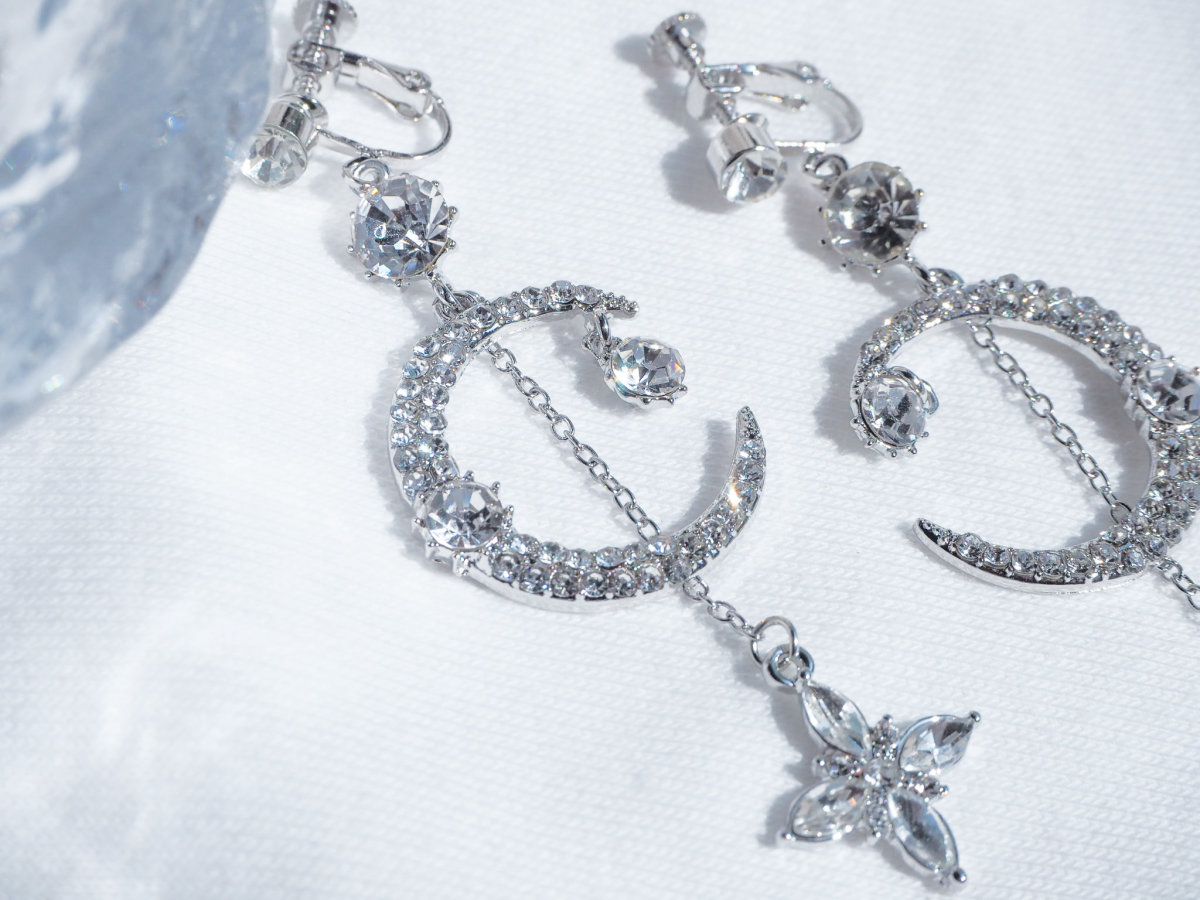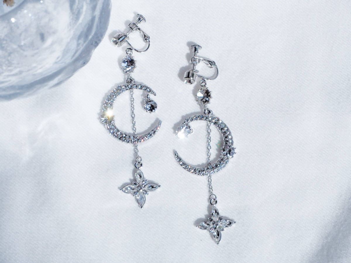 目を引く大きな月には小粒ビジューがしき詰められ、大粒ビジューが2つ添えられています。その後ろからはチェーンにつり下げられた星が輝いています。