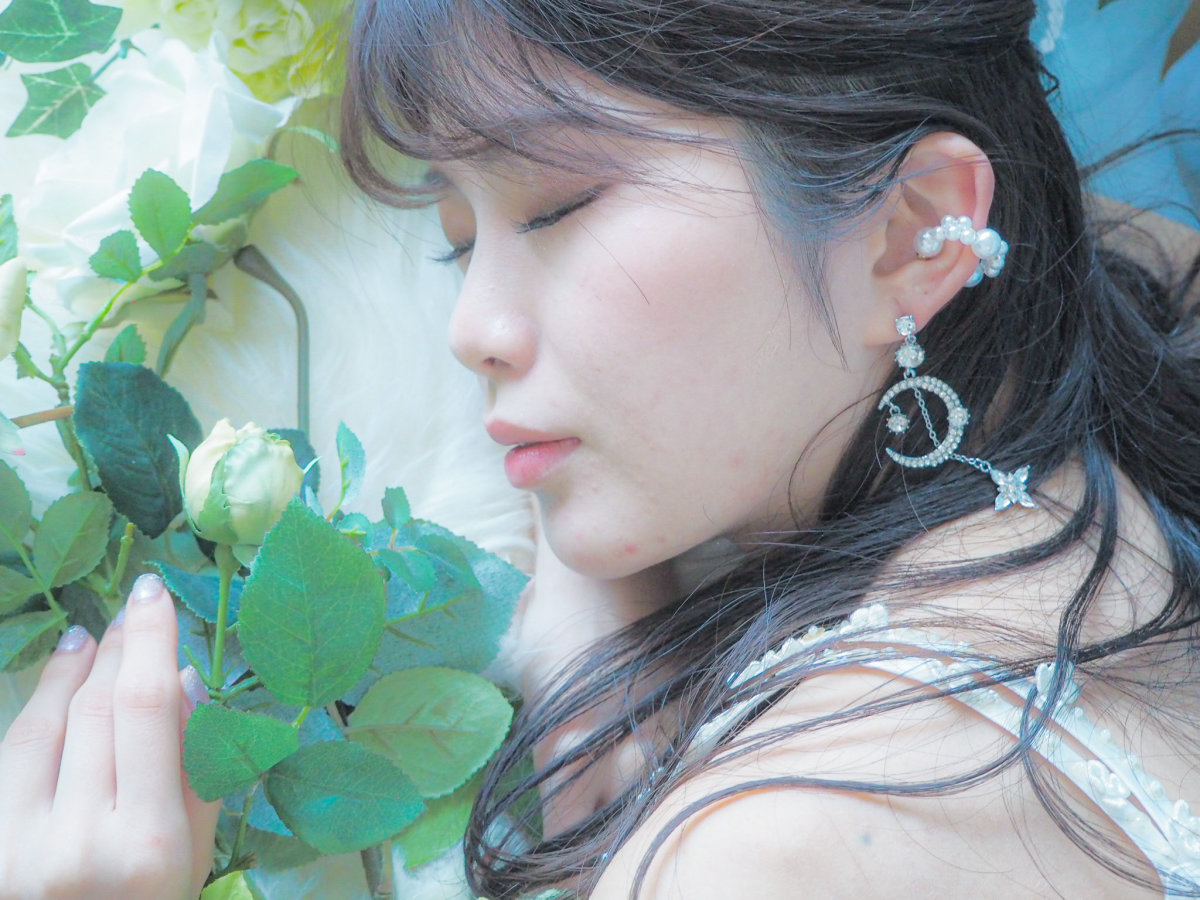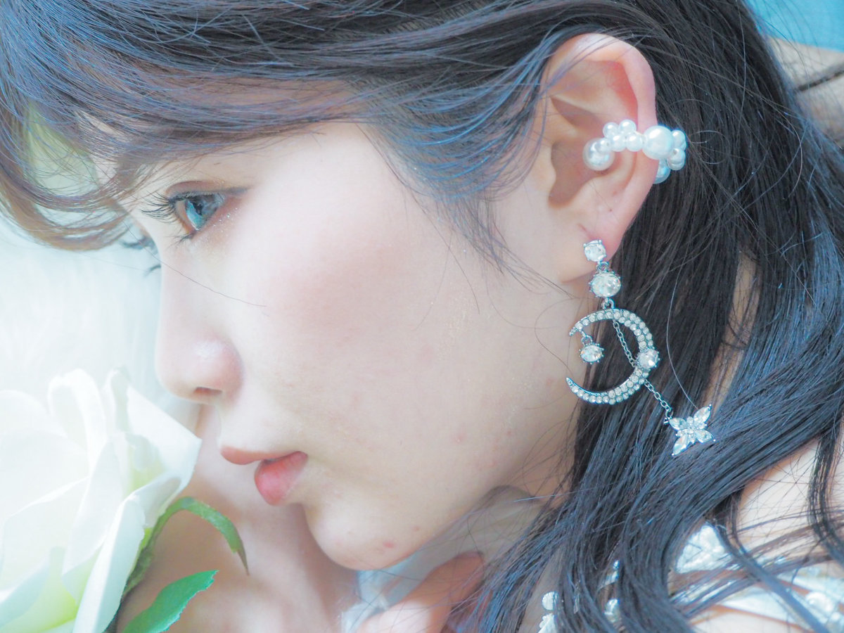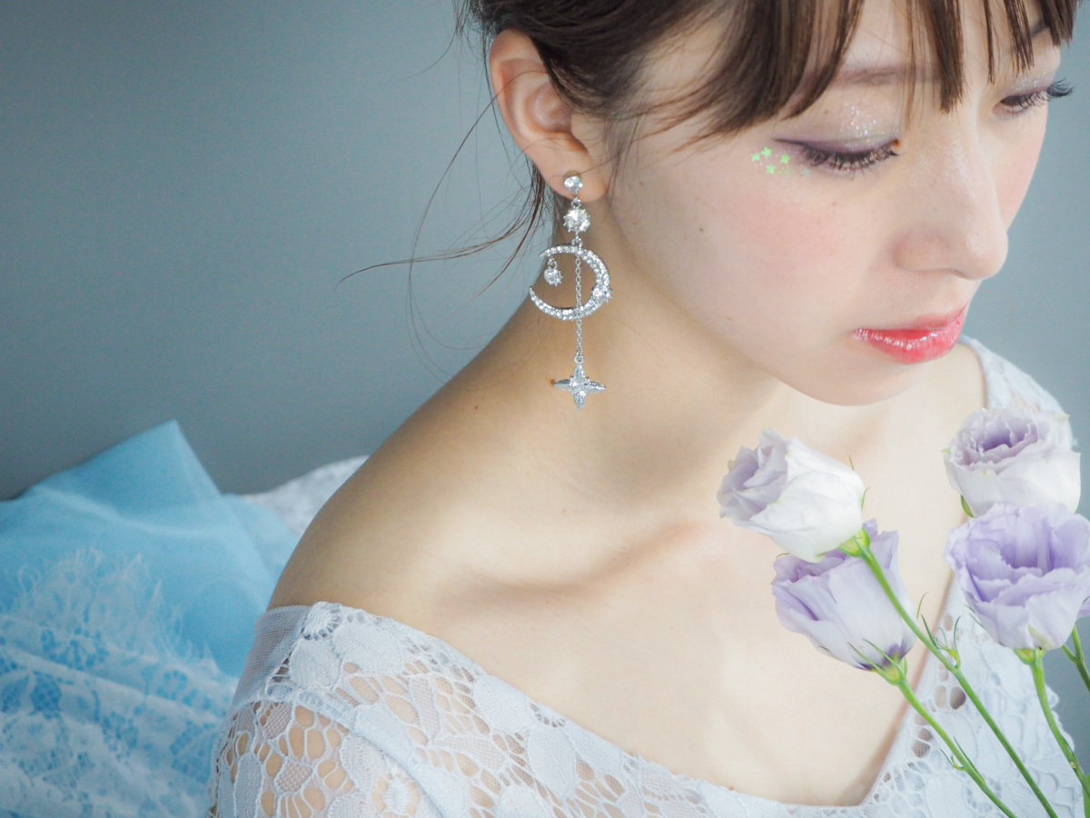 目を引く大きな月には小粒ビジューがしき詰められ、大粒ビジューが2つ添えられています。その後ろからはチェーンにつり下げられた星が輝いています。