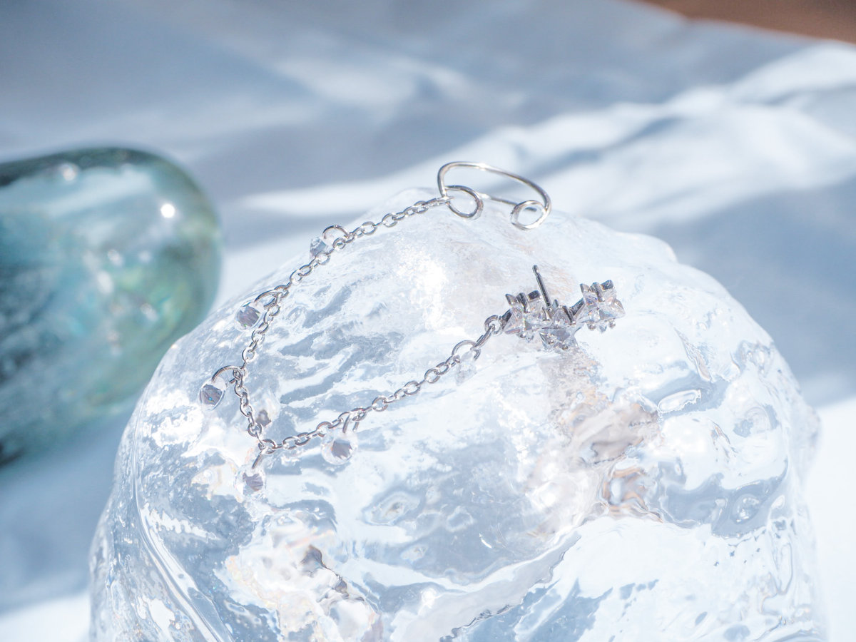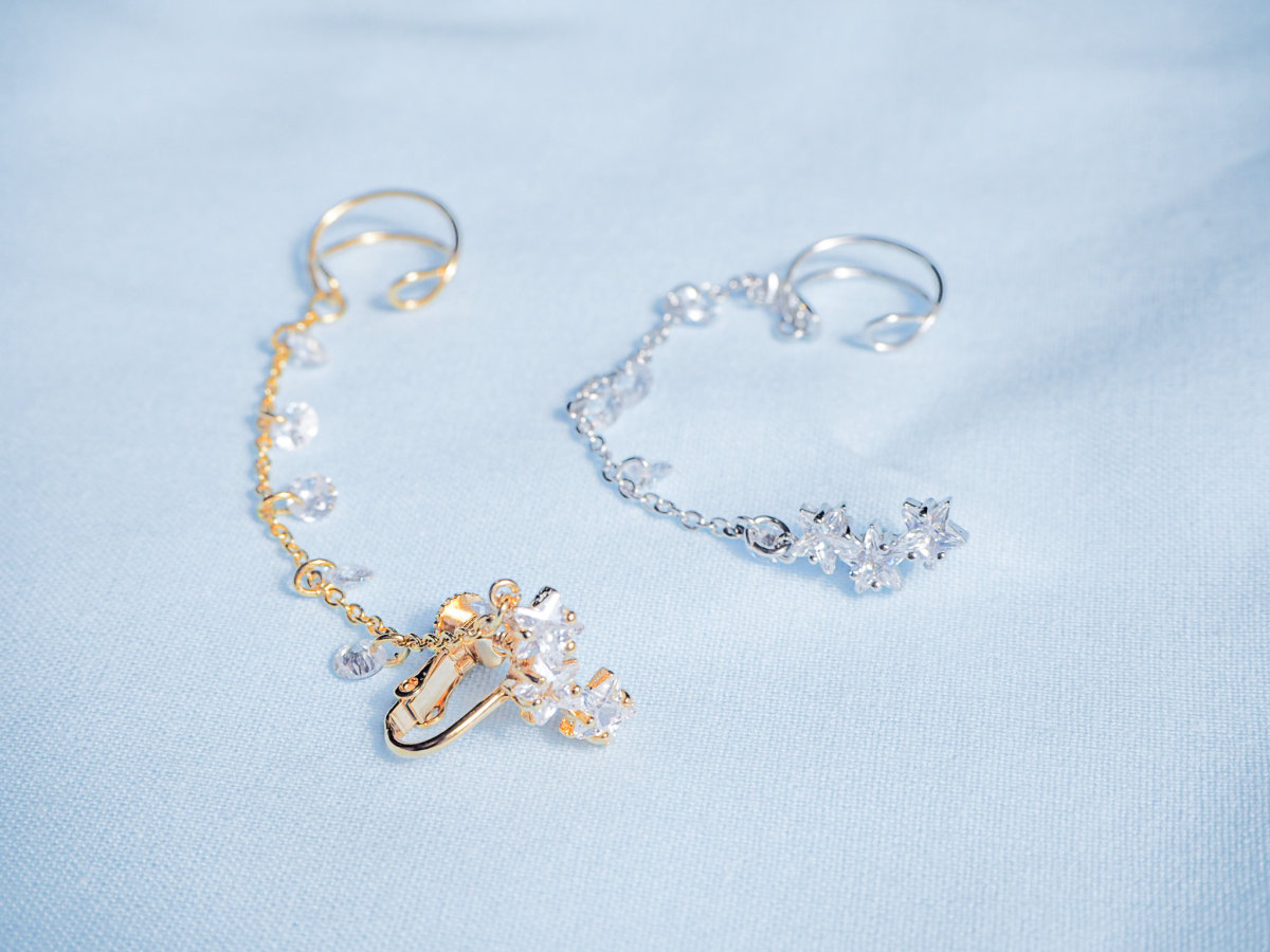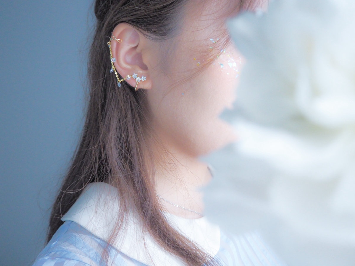 イヤーカフにつながるチェーンには丸くカットされたクリスタルがたくさん揺れる様は、空にきらめく星の光のまたたきのように見えます。