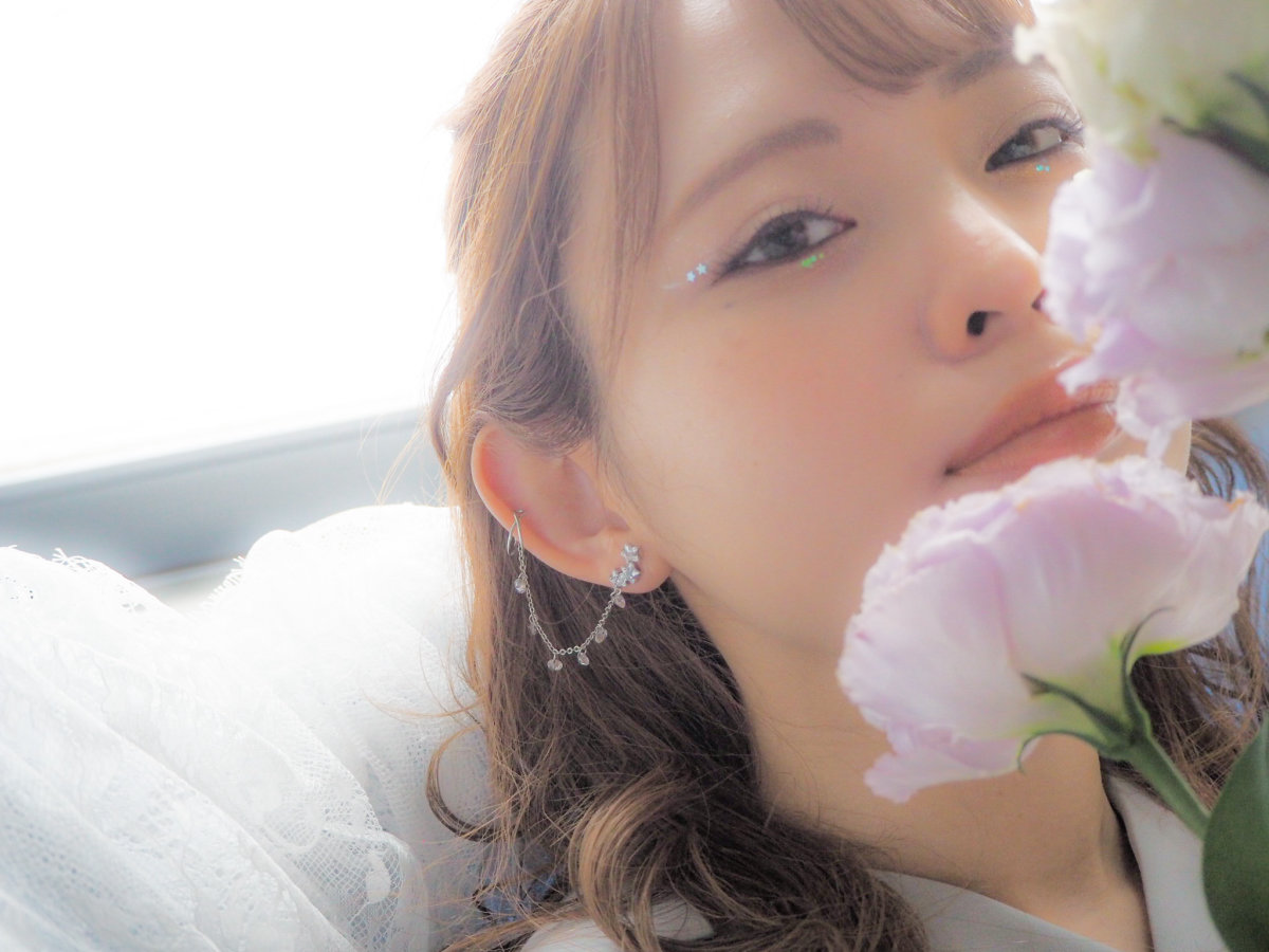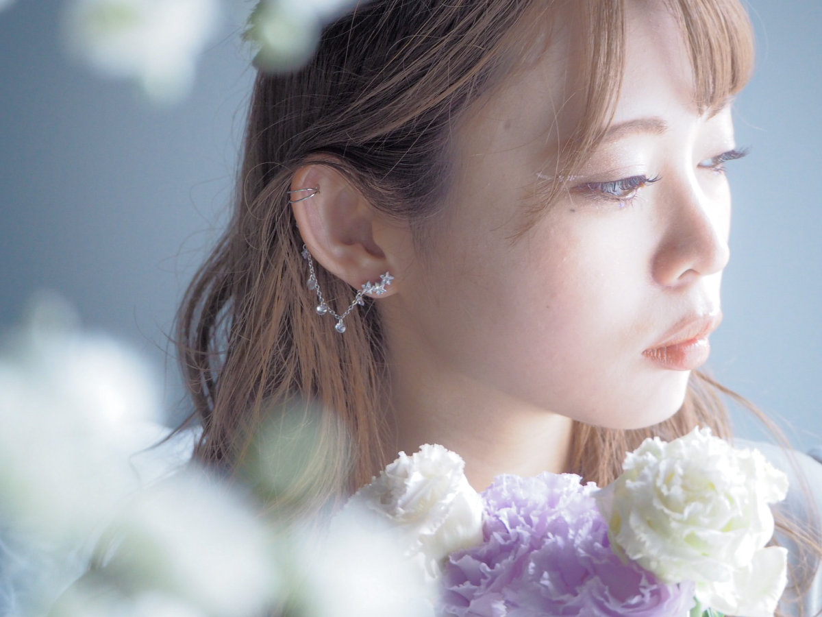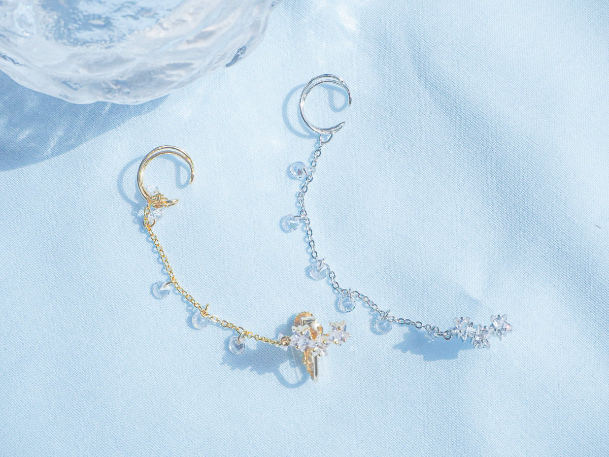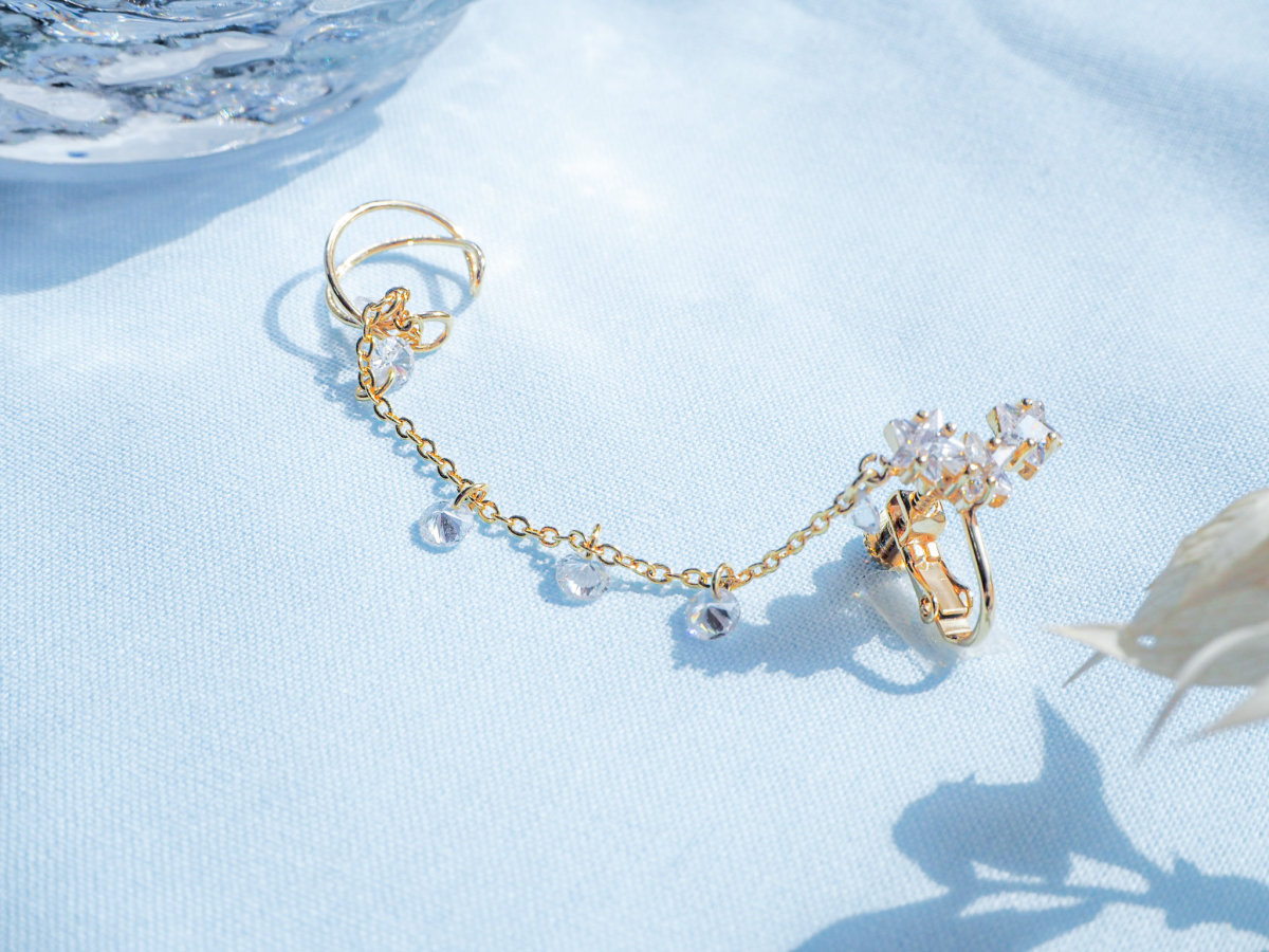 イヤーカフにつながるチェーンには丸くカットされたクリスタルがたくさん揺れる様は、空にきらめく星の光のまたたきのように見えます。
