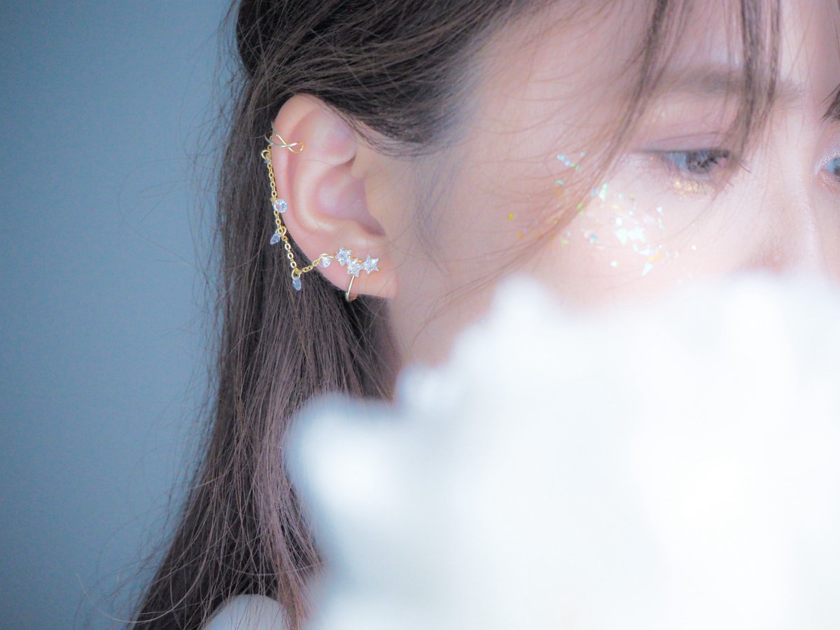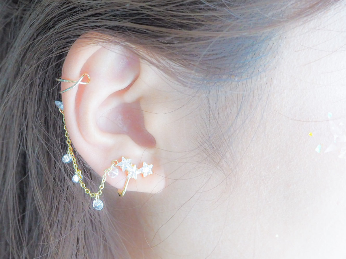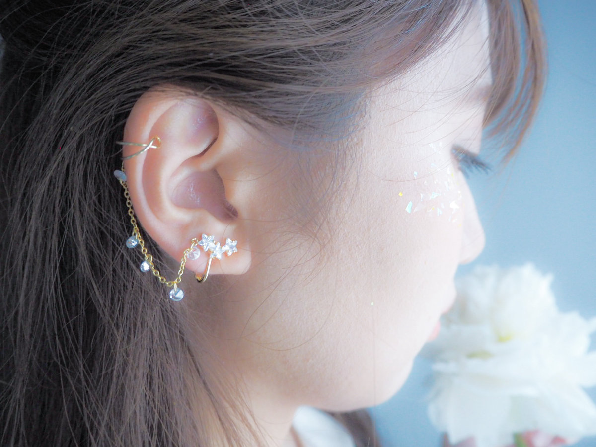 小さな星が耳たぶに飾られ、イヤーカフはシンプルなワイヤーデザインです。