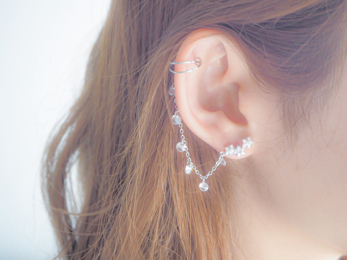 星が連なるイヤーアクセサリーに丸いクリスタルチャームがいくつも付いたチェーンがイヤーカフにつづいています。